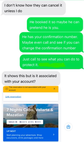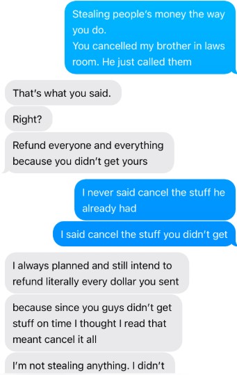 Since I demanded a refund from him on everything he cancelled my brother in laws cruise (a cruise that had a confirmation number and was booked by him separately)… I’m going to have to pay for his loss too. So add another $1400 to my already $****
