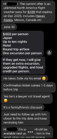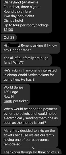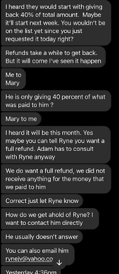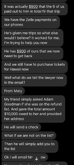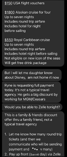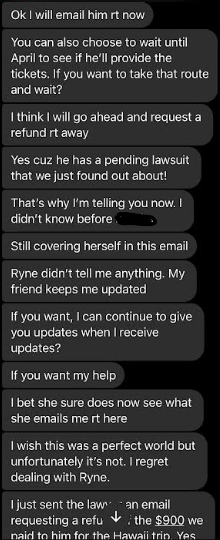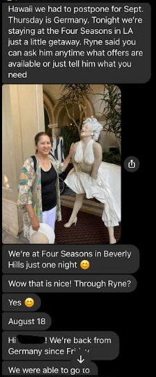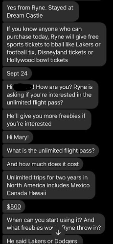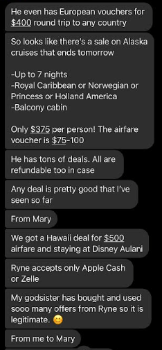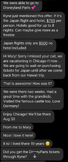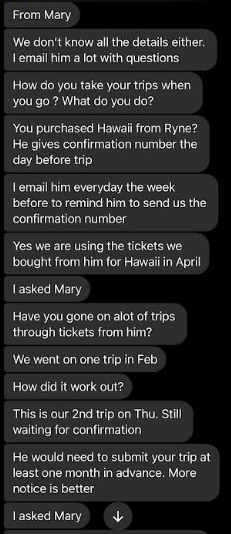Hello Jason, sorry I just opened up my messenger rt now and saw that you had messaged me. I as well also convinced that she is involved in his Ponzi scheme and I do also believe that she is not only a co conspirator of his, but a relative of his as well. I know it is late now. I really would like to talk to you on the phone about all of this. I am so angry and I feel so unbelievably betrayed by Mary and Ryne, but mostly Mary, because I have known her for such a long time and I truly trusted her, which is why we purchased the tickets through Ryne in the first place. Trusting what she said about Ryne. I have all if get texts to me from the beginning of her informing me about Ryne and his discounted airline tickets, cruises and hotel stays saved on my phone, where she states exactly who and how to submit payment and how it worked. Can you call me tomorrow at 1:00pm my time , that is my lunch hour so we can talk about all of this? If not you can call me after 6:00pm . Thank you and I look forward to hearing from you!