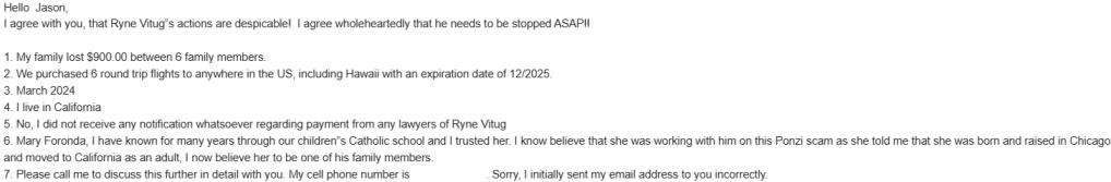 Good afternoon Jason! I just finished reading the first Real Stories, Real Victims! I am completely stunned rt now! As I was reading her story, I became so angry as I realized now that the $900 my family and I paid for our round trip flights to anywhere in the US, including Hawaii and Alaska was used most likely to pay her the money back which Ryne owed to her. No wonder Mary Foronda kept texting me and pressing me on what a great deal it was!!! My blood is boiling rt now as I truly realize that I was completely used by a person who I had known for about 18 years now, i was invited by her and went on a religious retreat with her, I visited her at her house, she, her mom and son were invited and attended my Mother’s funeral 5 years ago. I completely trusted her and I feel utterly speechless and completely backstabbed by her. I would have lent her the $900 or print even given it to her if she needed it, because I truly thought she was a wonderful lifelong friend to me. But to take it this way from my family and is horrible, I feel completely betrayed. I now feel like I cannot trust anyone ever after this and will be putting up a wall going forward when it comes to friendship. Can you please do me a favor and put this with the questions that I previously answered and post it for me please? Thank you so very much Jason, you are amazing , ALL of us victims appreciate more than you will ever know! YOU are truly amazing