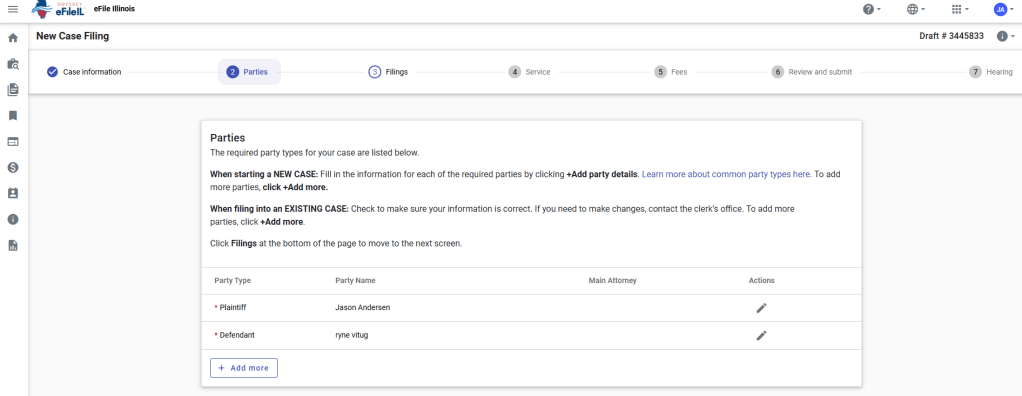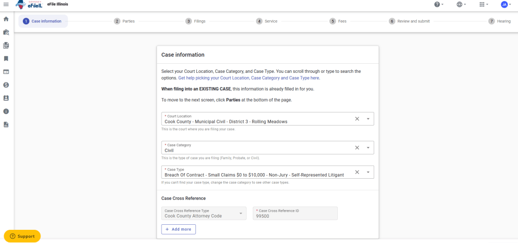 Step 10. Below is how I filled out my application. His Illinois bar license address is in Schaumburg, Illinois. So I filed here. Municipal Civil – District 3 – Rolling Meadows. Case category – Civil. Case Type – Breach of Contract – Small Claims $0 to $10,000 – Non-Jury – Self-Represented Litigant.