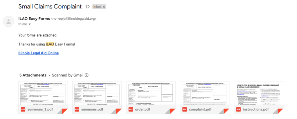 Step 7. Once all filled out you should have a small pile of attachments that look like this. Side note if you do not have adobe you can use Illinois Legal Aid Online to fill out the forms as well in one package. However, that website is a little more difficult to navigate compared to the one above. Here it is if you want to check it out. https://www.illinoislegalaid.org/