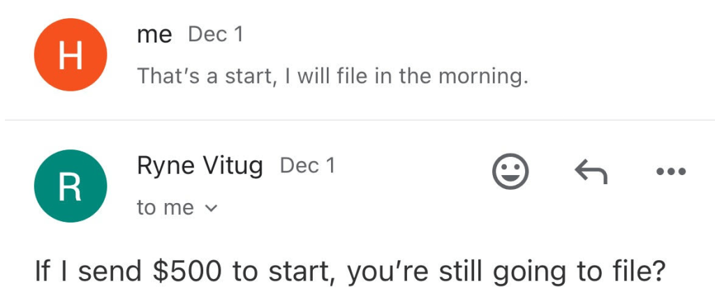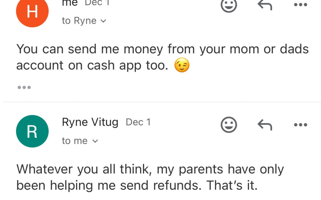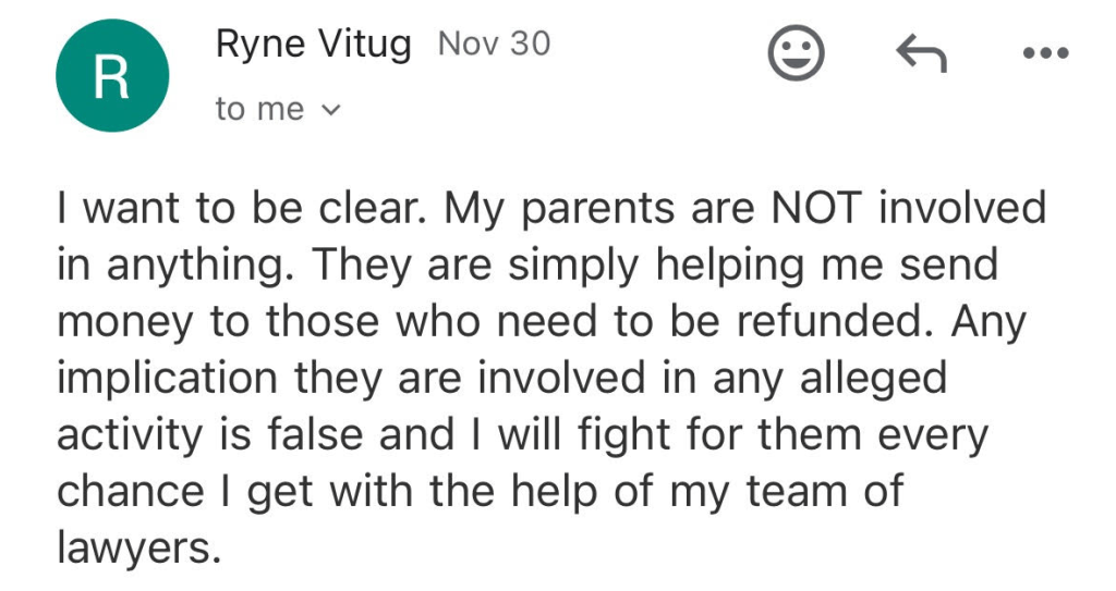 Sure, Ryne. We super believe you. But quick question why are they sending refunds for you if you turned the money over to your lawyer? OH RIGHT! Unless you didn’t and your family is in on it. Thanks for literally making the point for me.