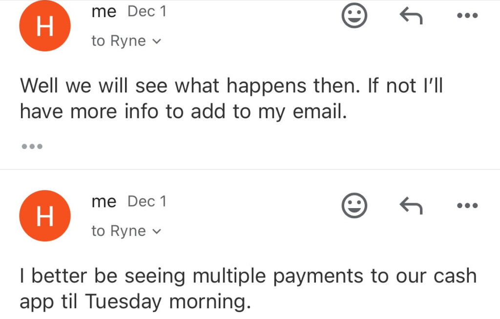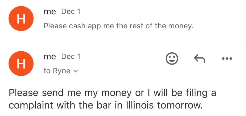 I got this information from a victim today. Ryne owed her $1,200 since June of this year. He reached out last night through email. It was only after she threatened him with an Illinois AG consumer protection and bar complaint that he sent her $500 back through Cashapp. What’s strange is his lawyer told me that his lawyer is handling all the refunds and that Ryne has turned over all money in a show of good faith. Turns out, he was lying again. Truth is Ryne and his family are still out there collecting from victims everyday in an effort to pay you all some paltry sum compared to what he took from you to try and stay out of trouble. He doesn’t have a team of ‘new’ lawyers to fight this website. And sorry Ryne, but God isn’t going to save you this time. Mercy cannot rob justice. But I appreciate your constant attention to this website and with it the added search engine boost that you are giving me. Now onto the story.