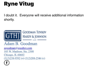 So if virtually none of the money went to any of the travel agents, then we would assume that Ryne was in possession of 98% of the initial money and turned it over to Mr. Goodman’s office (as a show of good faith you know) – who in turn would send out letters indicating they had at least a 40% refund for us all and would not have any issue paying that out in December because that is still 60% less then Ryne collected in the beginning. All you have to do is withhold any legal action or complaints to varied state or federal agencies – because that’s just gonna delay things. If that was true, and a good chunk of victims are sitting waiting for their December payments, then explain the answer provided by Mr. Goodman below when asked by someone yesterday….