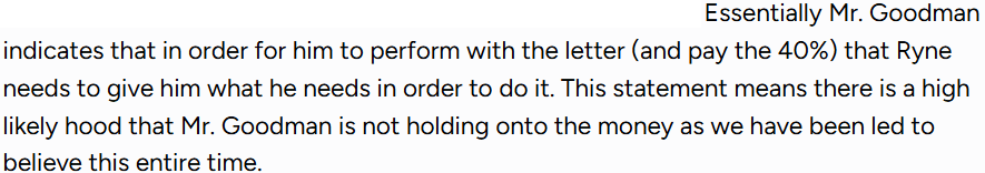 Jury is still out on Mr. Goodman. If he hasn’t considered it already, he will when he reads this because he knows that lawyers are prohibited from knowingly engaging in or assisting in illegal conduct (Rule 1.2(d)). If a lawyer knows that the retainer funds are stolen, accepting them could be seen as aiding or abetting in the concealment of a crime or fraud. The American Bar Association (ABA) has emphasized that lawyers must not knowingly use funds from illegal activities for their fees, as this violates ethical standards. I would say that using our money, to defend Ryne, against us, sounds sus.