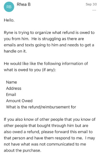 “Rhea did take orders for him in October when she was going around asking how much he owed us via email. I did receive a letter from his first lawyer, probably in October as well. The latest correspondence we had was last week and he [Ryne] got angry I am involving her … Rhea is naughty for sure! Please let me know if I can be of more help. Thank you for doing this!”