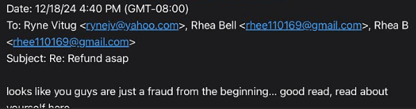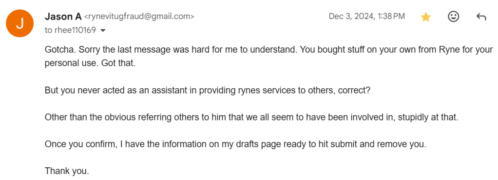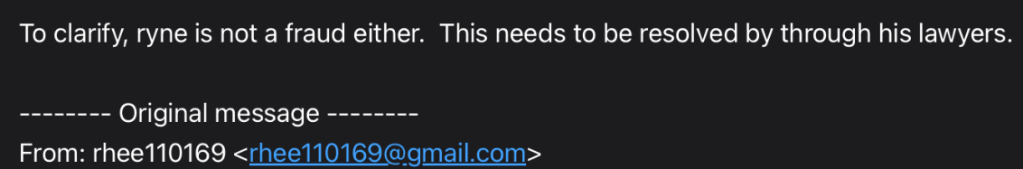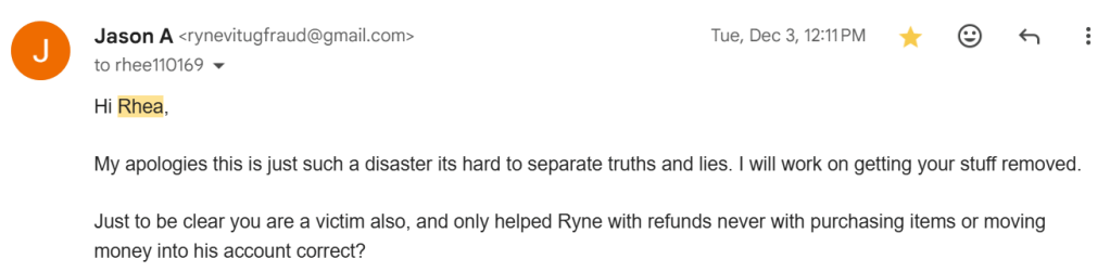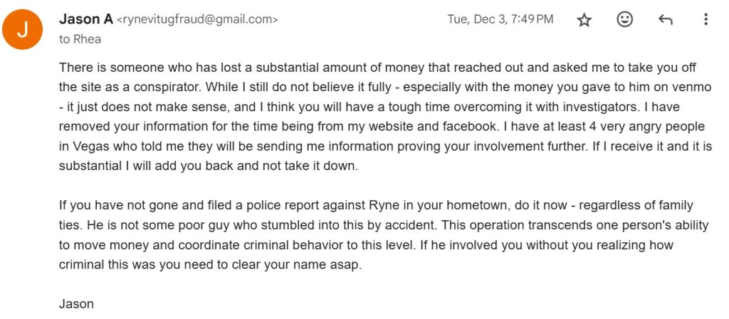 It was the 12/18/24 email to another victim when Rhea said: “Ryne is not a fraud either.”