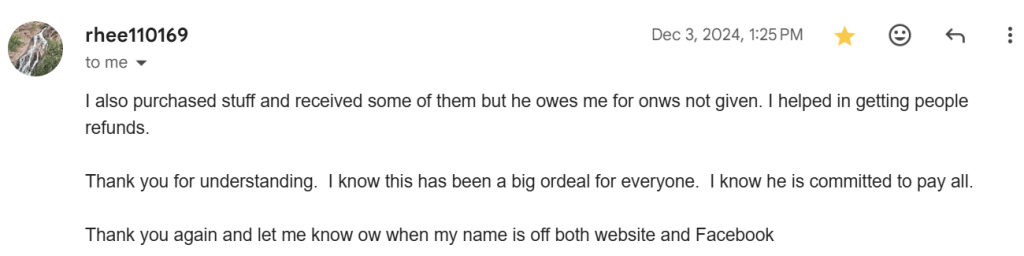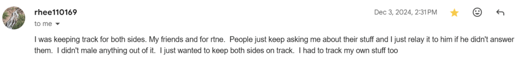That was until 12/18/24. When a new victim found my website and reached out to me and Rhea/Ryne simultaneously.