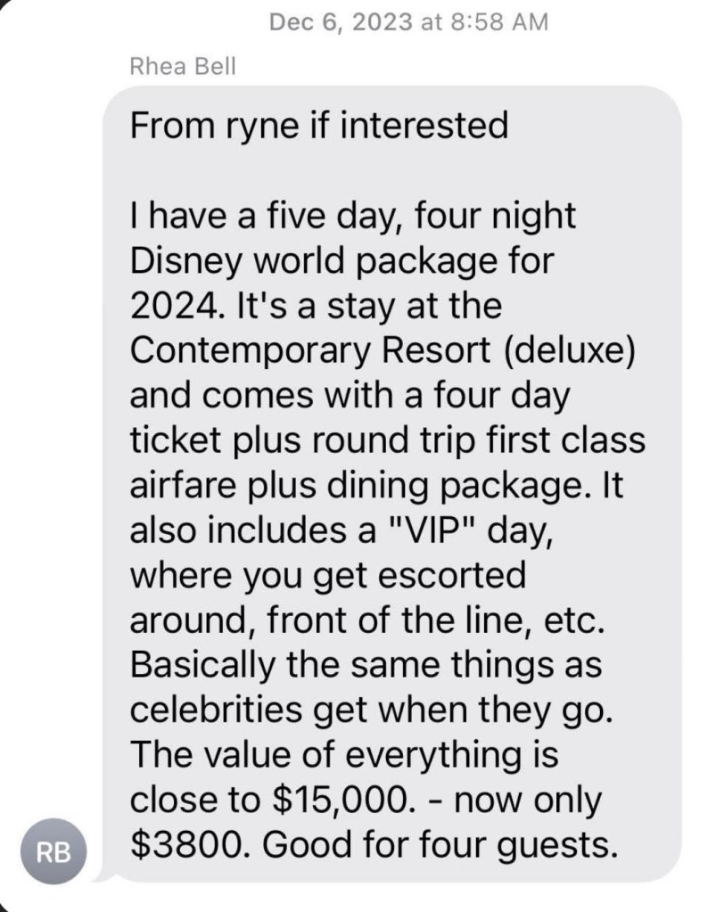 “She [Rhea] had told us Ryne was her nephew, when I asked her the other day she said no but in our culture it is common to say aunt and uncle etc if your close friend or family. She called [redacted] and told him of the great deals about an Aulani Package to Hawaii , He bit then started buying more trips. When we started not getting money refunded or trips. I called her and she said it wasn’t a Ponzie scheme but something happened with MGM and they are not refunding people money.”